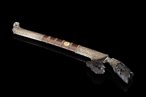Coltello cerimoniale dell'Isola di Ceylon con impugnatura in corno bovino nero scolpito con applicazioni in filigrana d'argento. Lama ad un filo, fodero in legno di teak rivestito in metallo sbalzato e cesellato a motivi vegetali e innesto sempre in corno nero scolpito. Probabile zona dei Tamil, ultimo quarto del secolo XIX (l. cm 30)