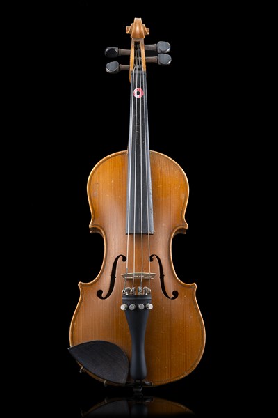 Fondo in due pezzi senza marezzatura, vernice di colore arancio bruno, in perfette condizioni, etichetta «Antonius Stradivarius» (lunghezza del fondo mm 286). Con custodia e due archi da violino ½