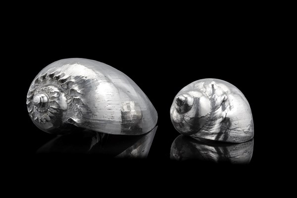 Lotto composto da due conchiglie rivestite in argento di diversa forma. Argentiere Buccellati