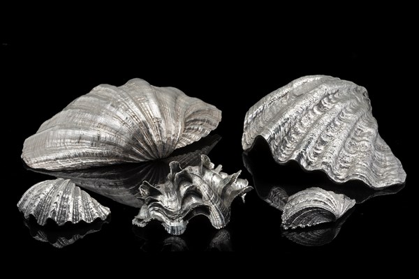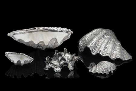 Lotto composto da cinque conchiglie di diverse dimensioni rivestite in argento