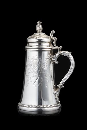 Boccale da birra in argento a corpo liscio inciso con stemma sormontato da elmo