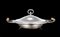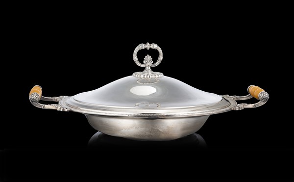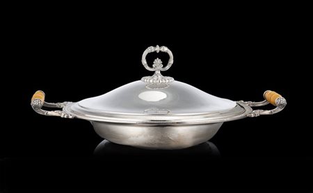 Legumiera biansata in argento decorata a palmette lungo il bordo. Anse in bachelite cesellate a volute e presa del coperchio ad anello. Titolo 800, Alessandria. Argentiere Ricci Cesa alla base (cm 37,5x17x29,5) (g lordi 1110)