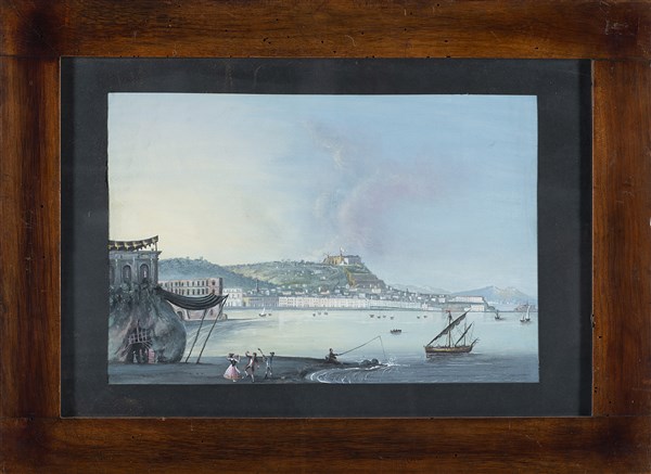 Scuola del secolo XIX "Veduta di Napoli da Posillipo con Palazzo donn'Anna e Castel Sant'Elmo sullo sfondo" gouache (cm 26x38,7) In cornice (difetti)