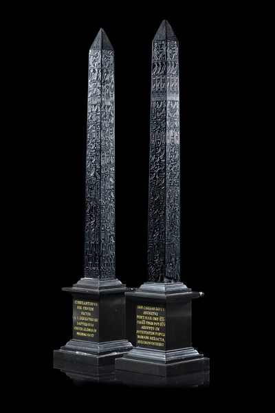 Modello della colonna lateranense e dell'obelisco di Montecitorio in marmo nero inciso sulle basi con inscrizioni in giallo. Roma, secolo XIX (h. cm 38,5) (difetti)