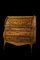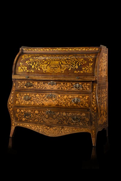 Ribalta a rullo lastronata e intarsiata in legni vari, fronte a tre cassetti e un tiretto decorato a vaso fiorito e motivi floreali, fianchi mossi. Anta ribaltabile celante cassettini e vano. Piano decorato da ringhiera in bronzo. Olanda, secolo XIX (cm 120x118x62) (difetti e restauri)