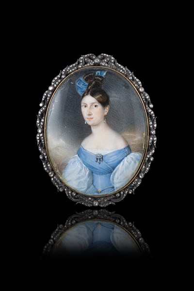 Maestro del secolo XIX "Ritratto di gentildonna in abito azzurro" miniatura ova