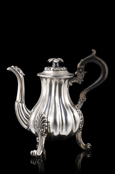 Caffettiera tripode in argento con corpo scanalato. Presa del coperchio a fiore a tutto tondo, manico in legno ebanizzato. Napoli, secolo XIX (h. cm 23) (g lordi 800) (difetti)