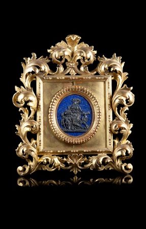 Composizione in argento su placca in lapislazzuli raffigurante Allegoria della Primavera, titolo 800, argentiere Stefani, Bologna (cm 11,5x10) In cornice del secolo XIX in legno intagliato e dorato a motivi fogliati (cm 33x28) (difetti)