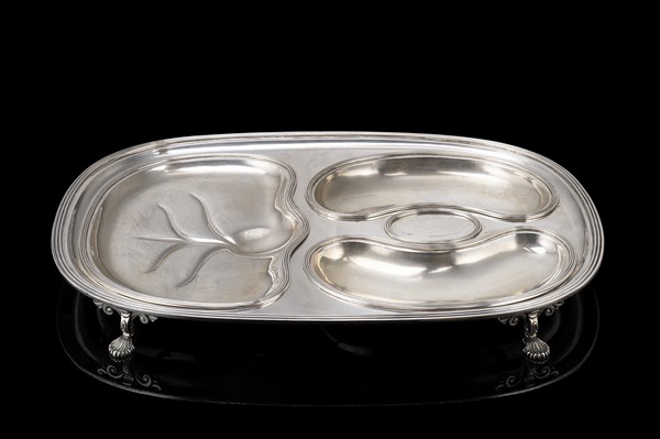 Vassoio antipastiera in argento liscio con tesa e bordure scanalate. Piedini a valva di conchiglia. Titolo 800. Alessandria, argentiere Cesa (cm 62,5x5,5x44) (g 4100)