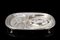 Vassoio antipastiera in argento liscio con tesa e bordure scanalate. Piedini a