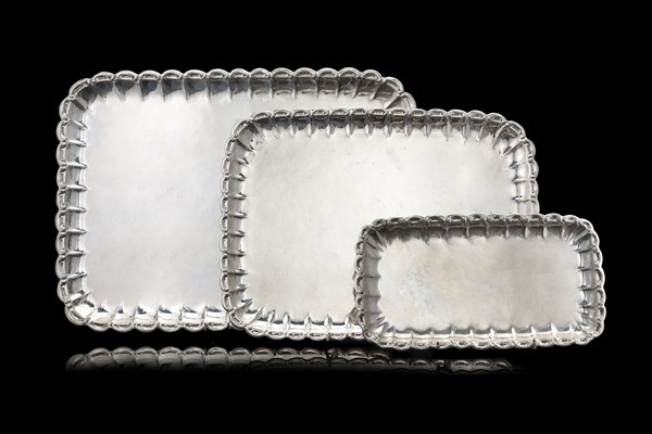 Gruppo di tre vassoi di forma rettangolare a bordo mistilineo. Titolo 800 (g 27