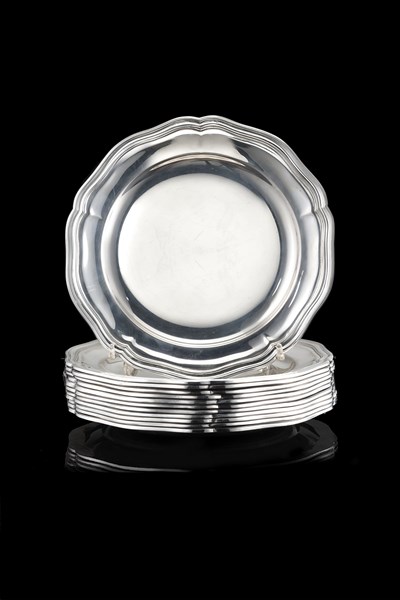 Gruppo di dodici piattini da pane in argento con bordo sagomato. Titolo 800 (d. cm 20) (g 2600)