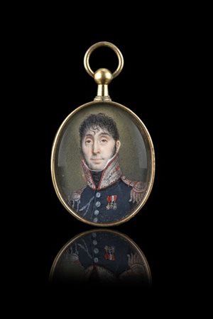 Artista del secolo XIX "Ritratto di Generale in uniforme del Regno di Francia con onoreficenze della Legion d'Onore, di San Luigi e ornamento del Fleur de lys" miniatura su avorio (cm 6x4,5) In cornice. Al retro cifre "D.L." entro ghirlanda floreale