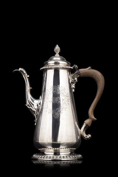 Caffettiera in argento a corpo liscio con cifre incise entro volute. Base circolare baccellata, ansa in legno e presa del coperchio a pigna a tutto tondo. Punzoni di Londra, 1760. Argentiere IB (?) (h. cm 26) (g lordi 770)