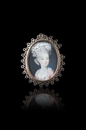 Scuola del secolo XVIII "Ritratto di gentildonna" miniatura ovale su avorio (cm 5x4) In cornice in metallo dorato (difetti e mancanze)
