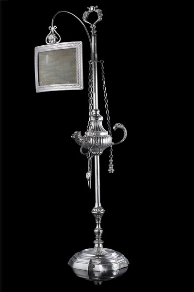 Lampada fiorentina in argento con coppa a due fiamme a guisa di aquile. Presa a