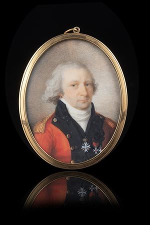 Scuola dell'inizio del secolo XIX "Ritratto di ufficiale dei Cavalieri San Giovanni di Gerusalemme" miniatura ovale su avorio (cm 6x5) In cornice in oro