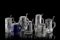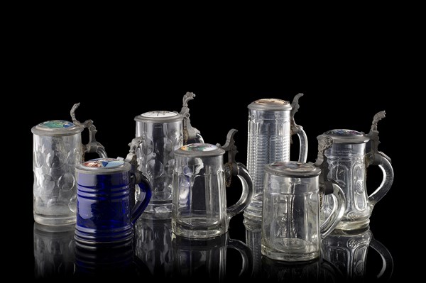 Lotto di sette boccali con bicchiere in vetro e coperchio in peltro decorato co
