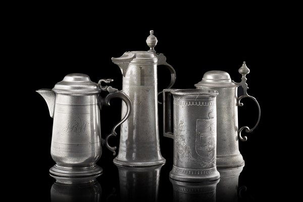 Lot 789 | Lotto di quattro boccali in peltro di epoche e decori diversi. Secolo XVIII/XIX