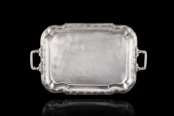 Vassoio biansato in argento a corpo liscio con bordo sagomato sbalzato a palmette ed anse cesellate a volute fogliate all'attacco. Titolo 800 (l. cm 58,5) (g 1695) (lievi difetti)