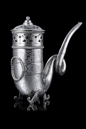 Lucerna a forma di pipa in argento cesellato e traforato a motivi vegetali, presa del coperchio a pomolo a tutto tondo, piedi a volute fogliate. Punzoni di Londra, 1884. Argentiere non identificato (h. cm 18) (g lordi 500)