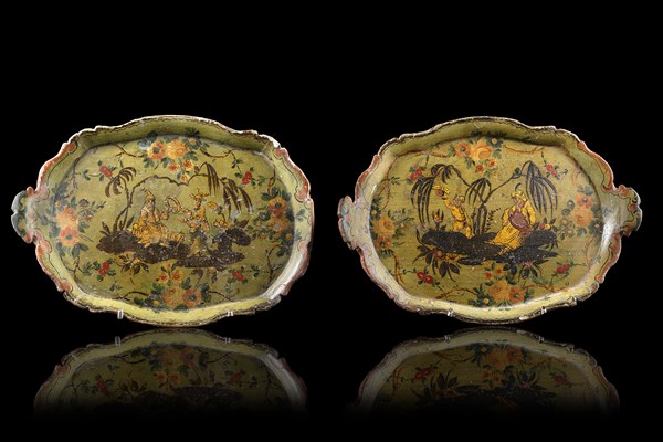 Manifattura veneta, fine secolo XVIII. Due vassoietti biansati di forma mossa in legno laccato e dorato, decorati da scene all'orientale (il più grande cm 29,3x20,3) (difetti, un'ansa mancante)