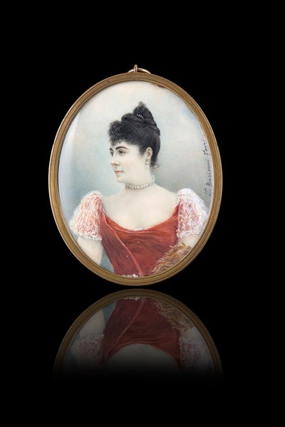 "Ritratto di donna con collana di perle" miniatura su avorio (cm 8,5x6,5) Firmata a destra. In cornice in bronzo