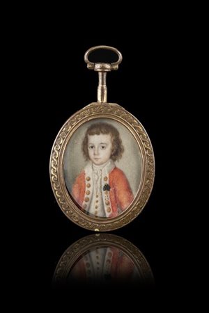 Scuola dell'inizio del secolo XIX "Ritratto di fanciullo con decorazione dei Cavalieri di Malta" miniatura ovale su avorio (cm 4x3,5) In cornice coeva in rame dorato (difetti)