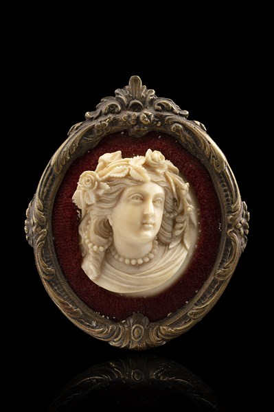 Artista del secolo XIX "Flora" cammeo in avorio scolpito (cm 4x4,5) (difetti) In cornice in bronzo dorato