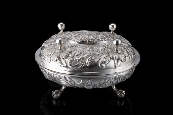 Zuppiera con coperchio in argento sbalzato a racemi e fiori, piedi ad artiglio che sorregge sfera. Titolo 925 (cm 27,7x16x23,5) (g 1530)