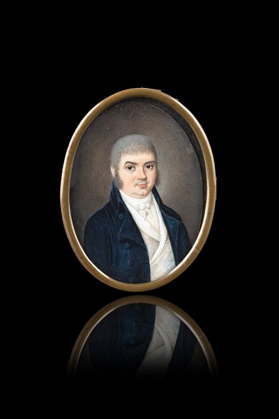 Maestro del secolo XIX "Ritratto di gentiluomo con giacca blu" miniatura ovale