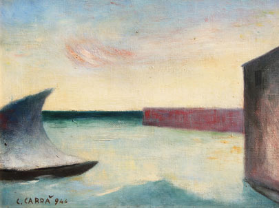 Carlo CARRÀ Quargnento 1881 - Milano 1966 Porto, 1944 Olio su tela cm 31 X 41 Bibliografia M. Carrà, ‘Carrà – Tutta l’opera pittorica’, Edizioni dell’Annunciata, Milano, 1968, vol. II, p. 533, rif. 19/44 Firma, data ‘C. Carrà, 944’ (in basso a sinistra) Etichetta della Galleria del Secolo, Roma; etichetta della Galleria d’Arte Cairola, Milano (al retro)