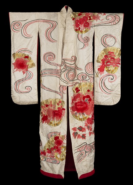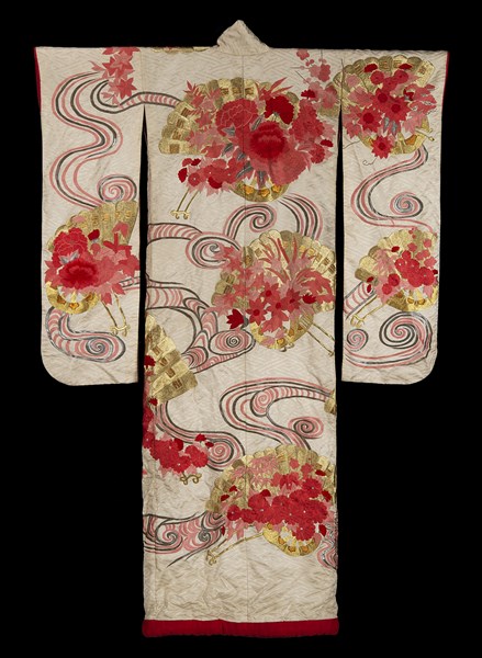 Kimono in seta operata ricamata in seta e fili di metallo dorato, Giappone, secolo XX. Decoro floreale nei toni del rosso, rosa e grigio su fondo bianco (Difetti)