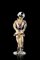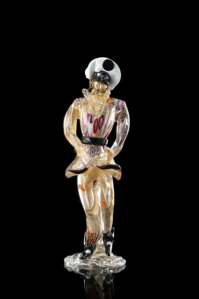 "Arlecchino" scultura in vetro soffiato incolore e murrine policrome con applicazione di foglia d'oro e inserti in pasta vitrea nera lattimo. Murano, anni '90/2000. Firmata a punta sotto la base (h. cm 33,5) (difetti e piccole mancanze)