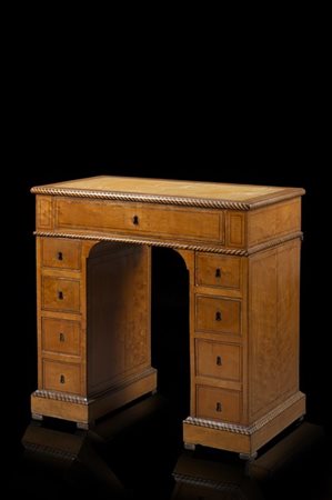 Scrittoio da centro a un cassetto sottopiano e otto nei montanti, fasce intarsi
