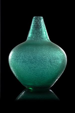 (attr.) Vaso a collo troncoconico in vetro soffiato verde trasparente corroso sulla superficie esterna. Murano, anni '50 (h. cm 28)