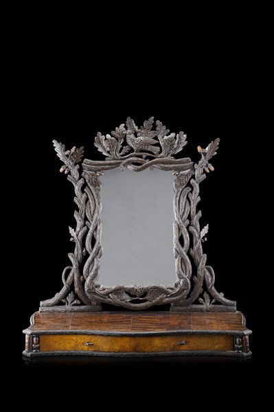 Psiche da tavolo lastronata con specchio basculante scolpito a rami con ghiande, cimasa con volatile, base sagomata a due cassetti. Foresta Nera, secolo XIX (cm 72x75x30)
