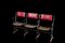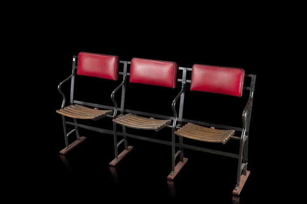 Three-seater cinema bench with black painted iron structure, folding seats in wooden slats, red synthetic leather backrests with black border. Italy, 1950s. (165x87 cm.) (slight defects)