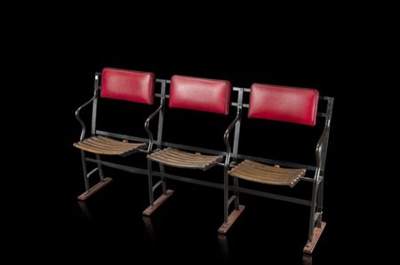 Panca da cinema a tre posti con struttura in ferro verniciato nero, sedute pieghevoli in listelli di legno, schienali in similpelle rossa con bordo nero. Italia, anni '50 (cm 165x87) (lievi difetti)