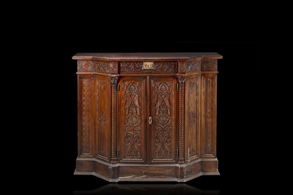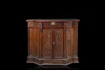Credenzino in rovere di forma sagomata a due ante e un cassetto con fascia e fronte intagliati a volatili esotici e animali diversi. Palermo, 1922. Iscrizione di provenienza al retro (cm 130x110x51) (difetti)