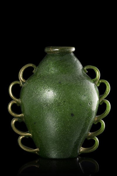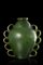 Grass green pulegoso blown glass vase decorated with a sequence of ten ribbed handles. Application of gold leaf on handles and applied edge. 20th century. (h 36 cm.)