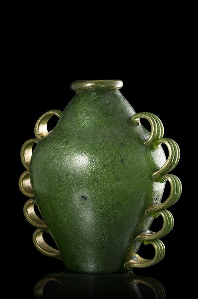 Vaso in vetro soffiato pulegoso verde erba decorato con una sequenza di dieci anse a nastro costolate. Applicazione di foglia d'oro sulle anse e sull'orlo applicato a caldo. Secolo XX (h. cm 36)