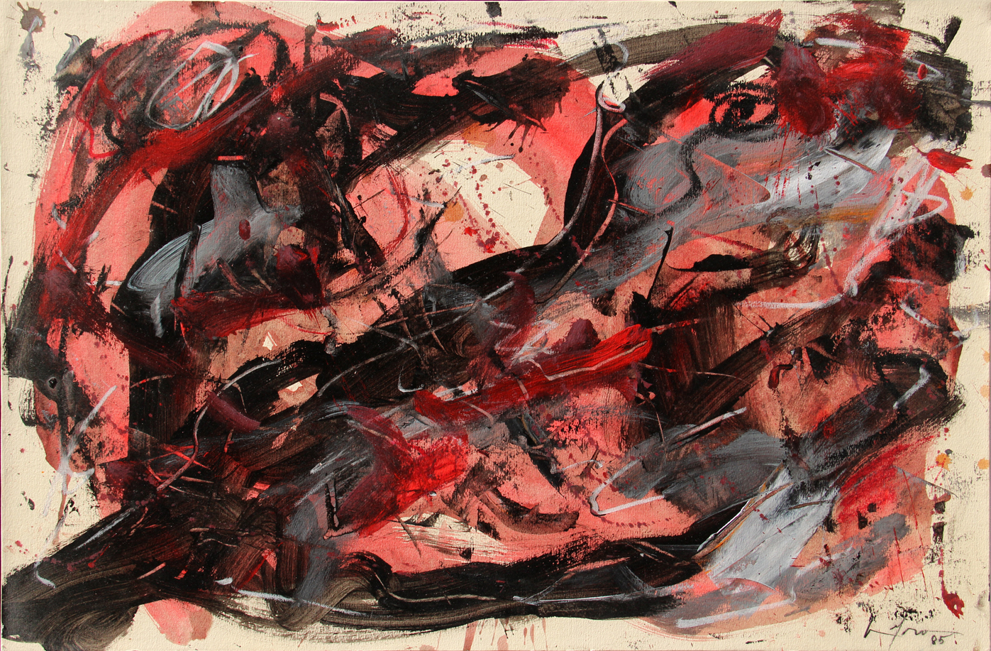 VEDOVA Emilio, Senza titolo, 1985, tecnica mista su carta intelata, cm. 46.8 x 70.6. Autentica a cura della Fondazione Emilio e Annabianca Vedova, con n. 131. E. Campaiola, "Emilio Vedova. Segno Gesto Materia", Reggio Emilia 2011, p. 30". Provenienze:Studio d'Arte Campaiola, Roma