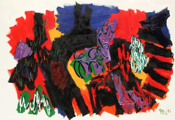 Karel APPEL Amsterdam 1921 - Zurigo 2006 Birth of a landscape, 1996 Olio su tela cm 140 X 200 Autentica su fotografia della Karel Appel Foundation Esposizione: Milano, Galleria Arte 92 – Karel Appel, opere 1991-2002 Firma, data ‘Appel, 96’ (in basso a destra) Etichetta Galleria Arte92, Milano (al retro) Provenienza: Galleria Arte92, Milano