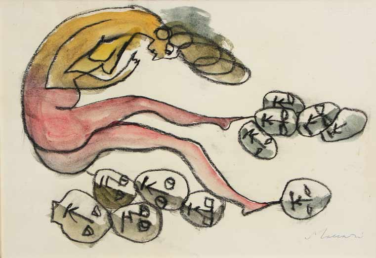 Mino MACCARI Siena 1898 - Roma 1989 Senza titolo, anni 70 Tecnica mista su carta cm 35 X 50 Autentica dell’Archivio Maccari su fotografia, con n° 2647 Firma ‘Maccari’ (in basso a destra)