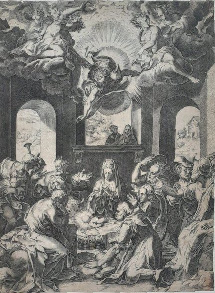 L’incisione di Cort riprende un disegno di Taddeo Zuccari. La scena si svolge all’interno di un edificio. Al centro il Bambino, accanto Giuseppe e la Madonna con le mani giunte, tutto attorno i pastori, due donne sullo sfondo assistono appoggiate ad un balcone, in alto degli angeli. Smarginata manca il riferimento agli autori in basso a destra e l’iscrizione in basso fuori dell’inciso.