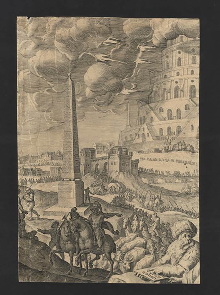 stampata nel 1582 da Johannnes I Sadeler (1550-1600), tratta dal "Le storie della Genesi": gli uomini, arroganti nelle loro presunzione di raggiungere Dio fino al cielo, iniziarono a costruire una grande torre in mattoni sul fiume Eufrate. A quel tempo tutti parlavano lo stesso idioma, ma Dio per confonderli e punirli per la loro colpa, fece in modo che non parlassero la stessa lingua, e non capendosi più gli uomini fuggirono dalla torre di Babele (che vuol dire confondere), non portando a termine la costruzione della Torre, disperdendosi sulla Terra