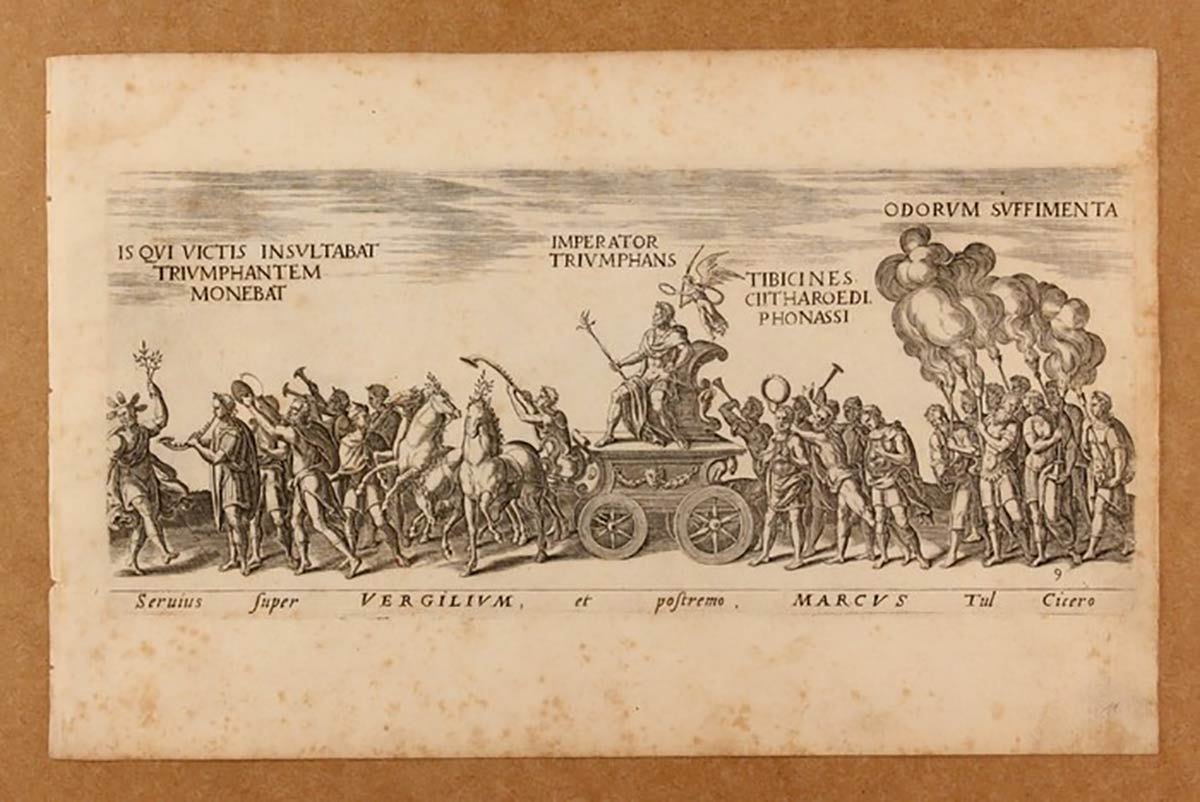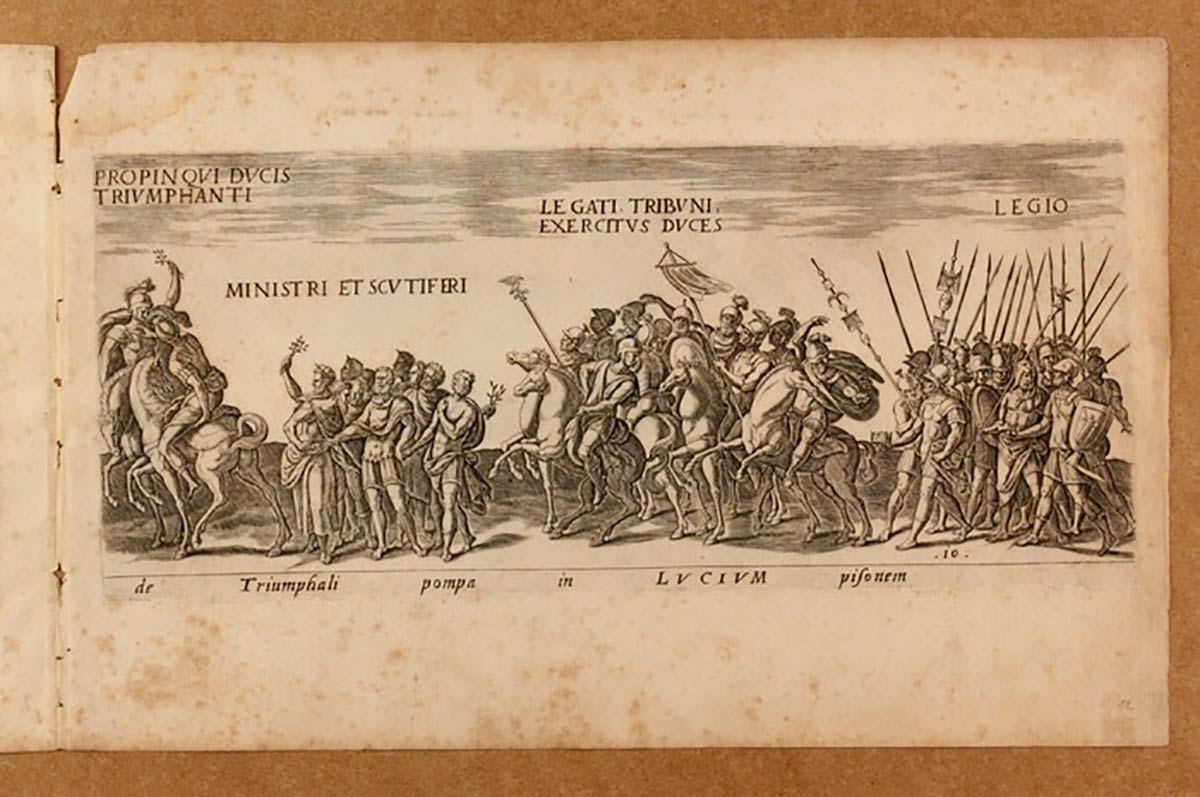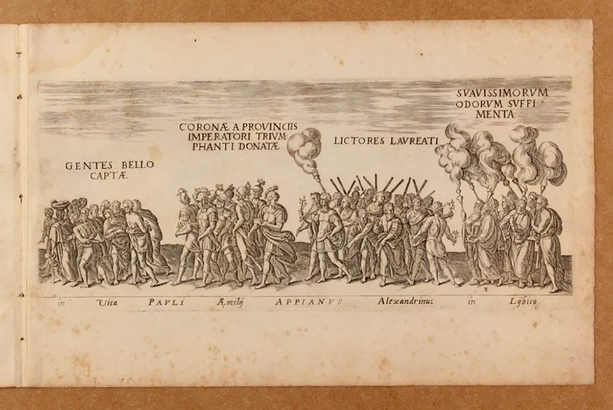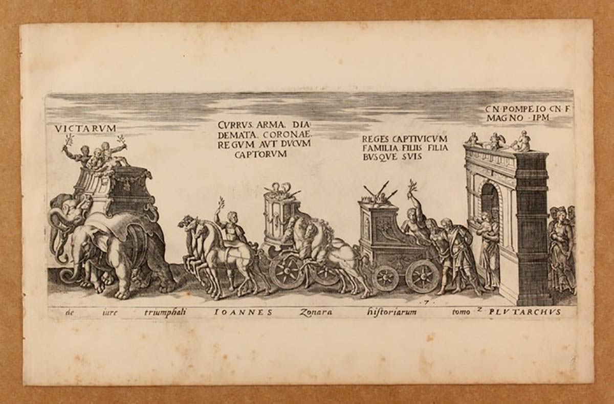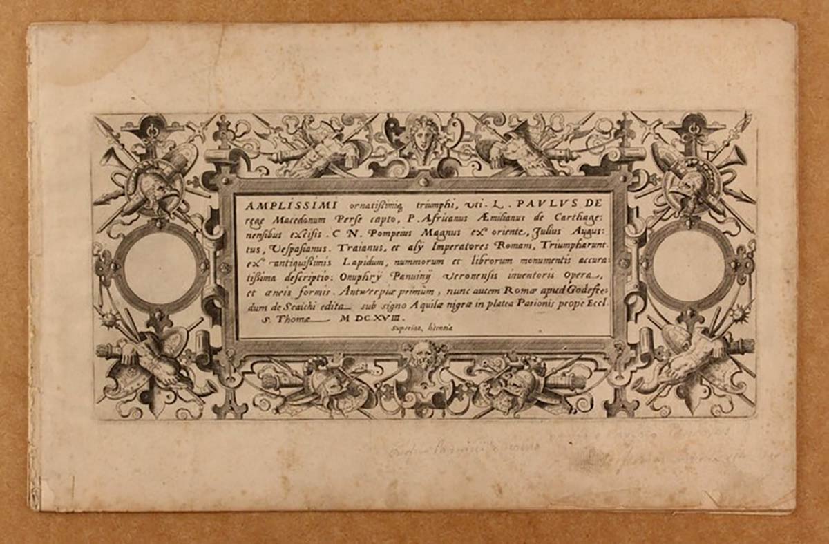 [Amplissimi ornatißimiq[ue] triumphi, uti L. Pavlvs de rege Macedonum Perse capto, P. Africanus Aemilianus de Carthagensibus excisis C. N. Pompeius Magnus ex Oriente, Julius Augustus, Vespasianus, Traianus et alii imperatores Romani Triumpharunt ex antiquißimis Lapidum, nummorum et librorum monumentis accuratißima descripti]di Onofrio Panvino (1530-1568), stampato a Roma da Godefredum de Scaichi, 1618, serie cpl di 12 tavv. (11+ frontespizio)