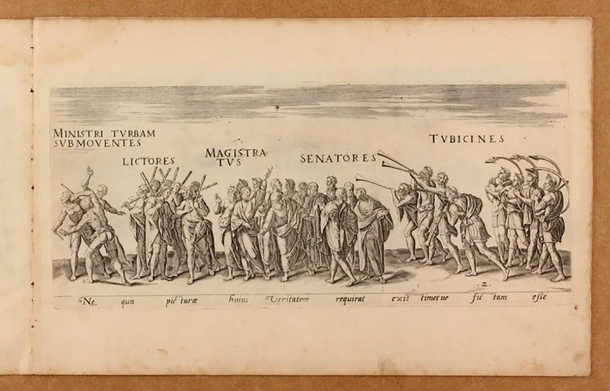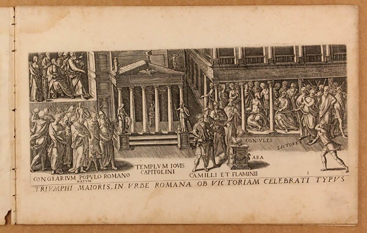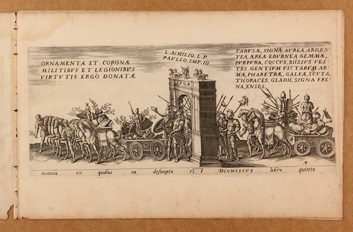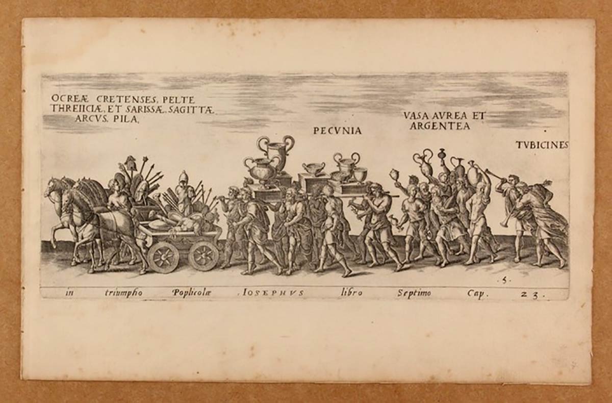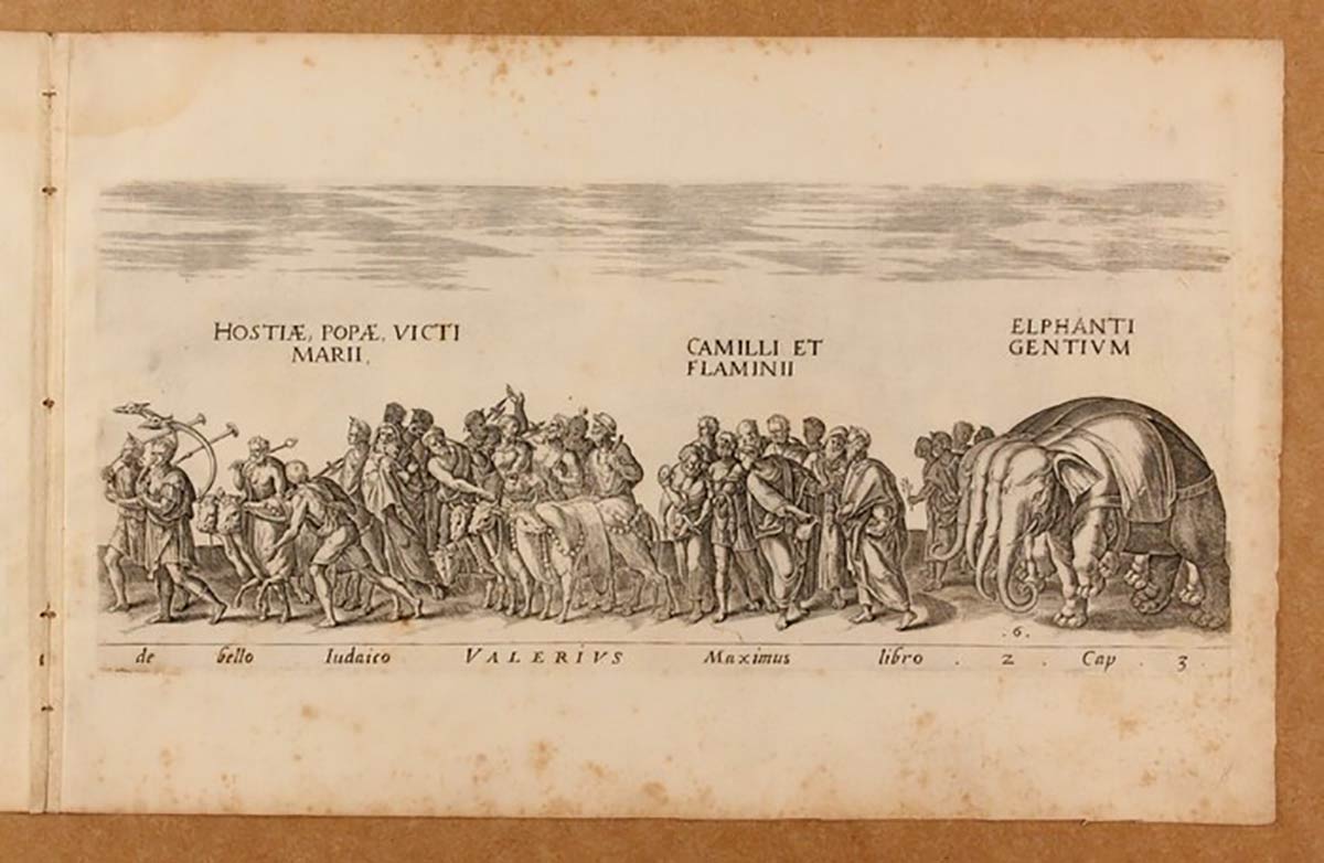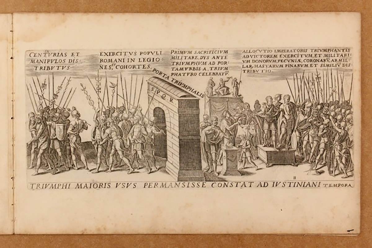 [Amplissimi ornatißimiq[ue] triumphi, uti L. Pavlvs de rege Macedonum Perse capto, P. Africanus Aemilianus de Carthagensibus excisis C. N. Pompeius Magnus ex Oriente, Julius Augustus, Vespasianus, Traianus et alii imperatores Romani Triumpharunt ex antiquißimis Lapidum, nummorum et librorum monumentis accuratißima descripti]di Onofrio Panvino (1530-1568), stampato a Roma da Godefredum de Scaichi, 1618, serie cpl di 12 tavv. (11+ frontespizio)