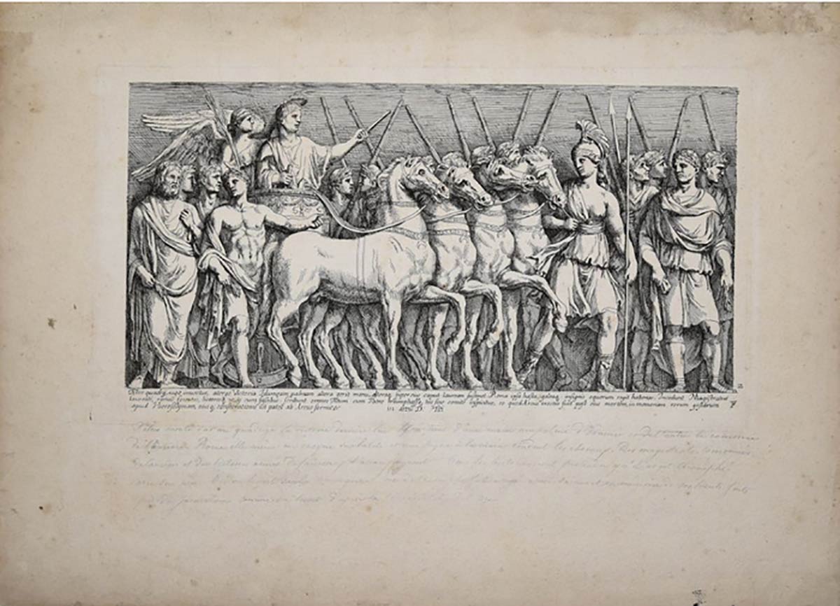 Antica e preziosa acquaforte realizzata nella prima metà del XVII secolo. L'opera rappresenta una processione di uomini e cavalli. Sul margine inferiore dell'opera è presente una lunga iscrizione con la descrizione della scena.